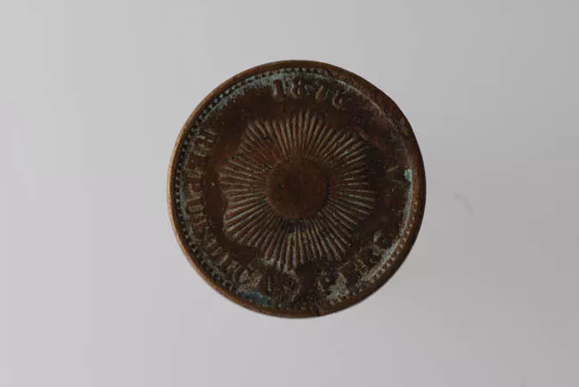 Objeto conmemorativo compuesto por una cadena de diez piezas de metal verde esmaltado de forma ovalada y cuatro piezas de metal dorada grabada con un sol. En su parte superior tiene un broche y en la parte inferior presenta una pieza metal; una pieza en forma de un figura alada y con piedra roja en sus ojos; y una venera de metal dorado esmaltado.