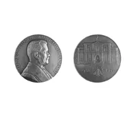 Pieza conmemorativa, circular y metálica; el anverso presenta un busto...