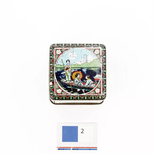 Objeto usado para grabar una imagen. Compuesto por dos lámina de metal montada en un prisma de madera de forma rectangular. Presenta tres figuras cónicas. En el reverso tiene papel adherido.