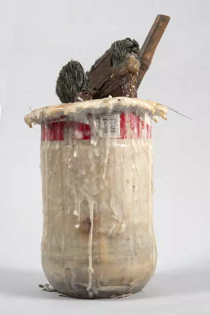 Conjunto de objetos compuesto por un contenedor con restos de cola sec...