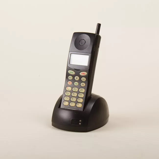 Conjunto de tres piezas formado por teléfono, su base y un cargador.