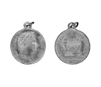 Objeto metálico de formato circular. En el anverso aparece un escudo d...
