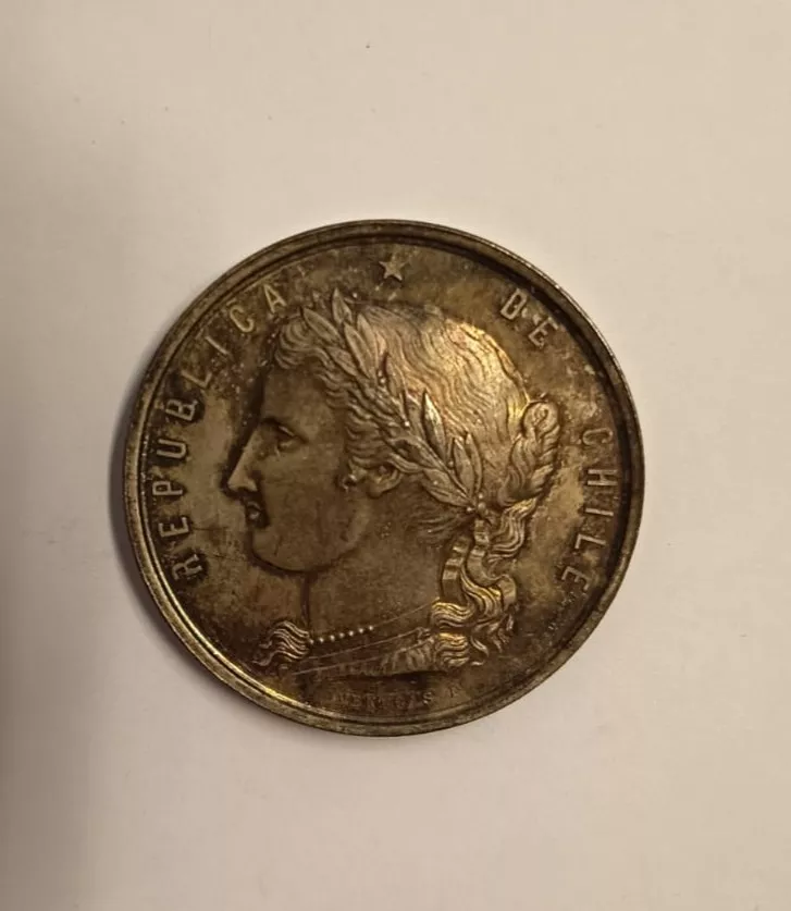 Objeto metálico de forma circular. En el anverso aparece una cabeza fe...