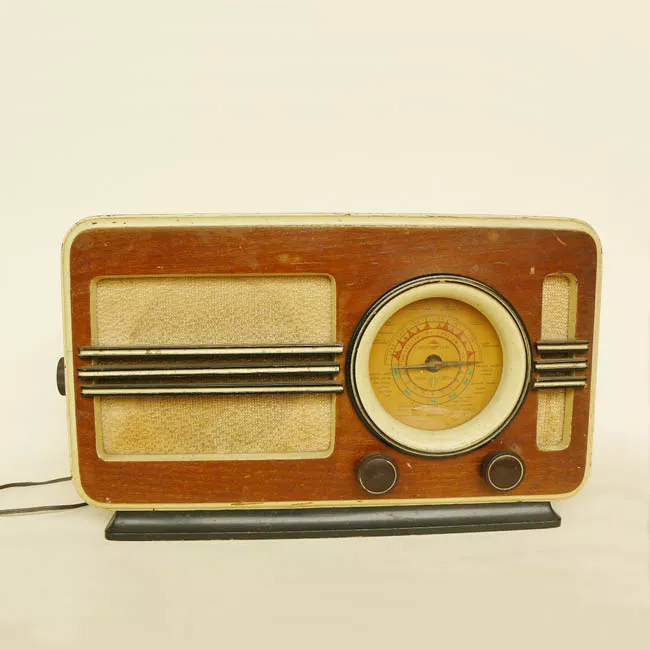 Caja rectangular de madera con circuitos de radio en su interior. Apar...