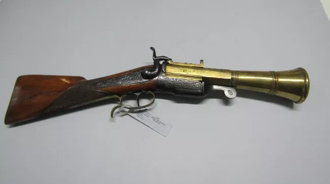 Arma de fuego portátil de retrocarga. Constituída por caja, mecanismos y cañón. Caja de madera compuesta de cureña y caña. Cureña rematada en coz de acero. Caña de madera con abrazadera media y superior. Cañón de acero simple con un impacto de bala, de ánima estriada, con alza y punto de mira.