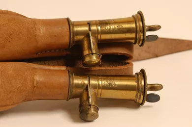 Arma de fuego corta de percusión, modelo de bolsillo, con dos cañones superpuestos rotatorios. Le falta la tuerca que afirma los dos cañones y el percutor. Cachas de madera.