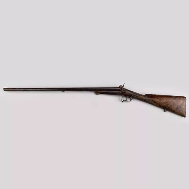 Arma de fuego corta de percusión de dos cañones paralelos de doce milímetros, de fulminante, con bayoneta de resorte. Percutores y caja grabados con motivos fitomorfos.