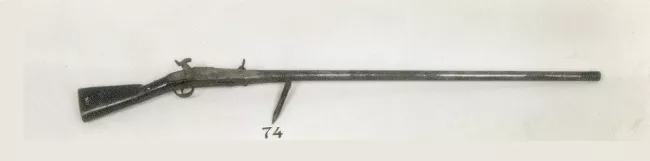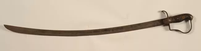 Espada de hoja recta, con empuñadura con conchas de hierro ovaladas. Cruceta recta con dos gavilanes que se curvan hacia la hoja, al centro de las conchas, y otro gavilán que se curva hacia el pomo, formando un guardamanos delgado y simple. Mango recto, con entorchado de hierro, pomo en forma de rombo, facetado. Las conchas están unidas por remaches a la empuñadura. Sin vaina.