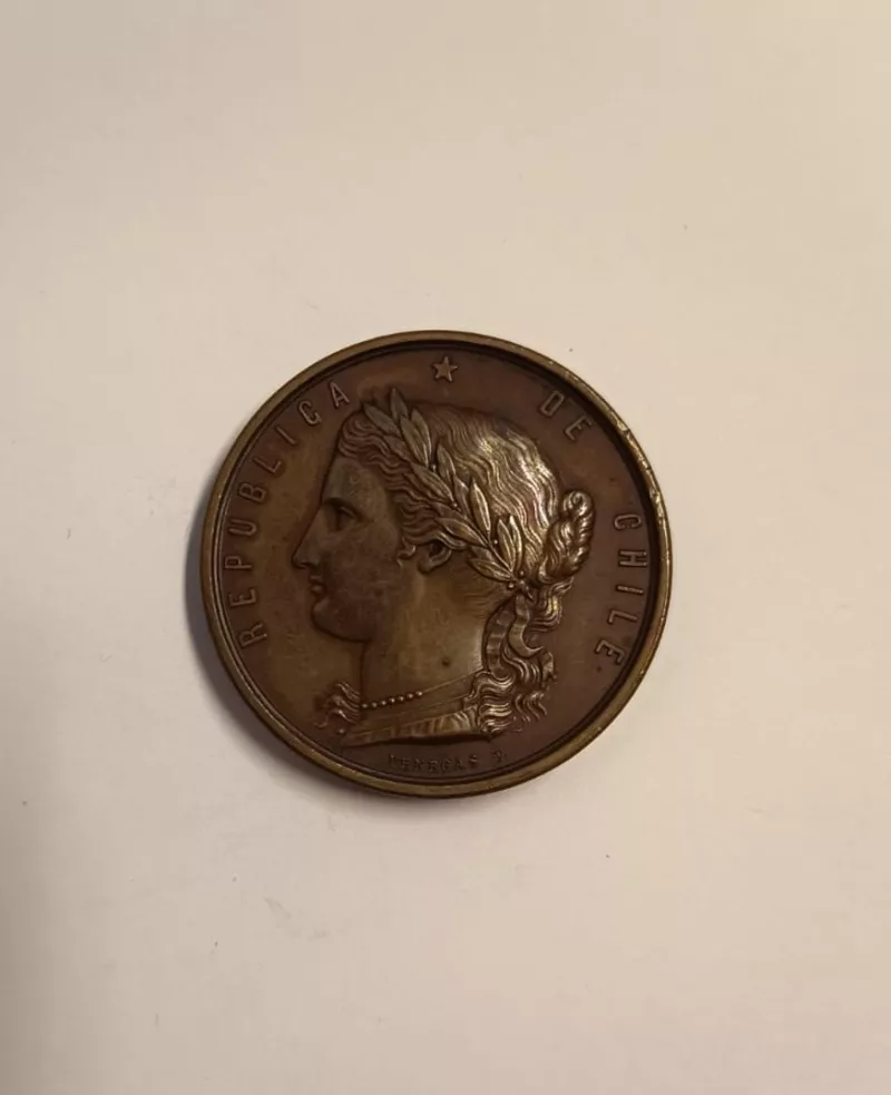 Objeto metálico de forma circular. En el anverso aparece una cabeza fe...