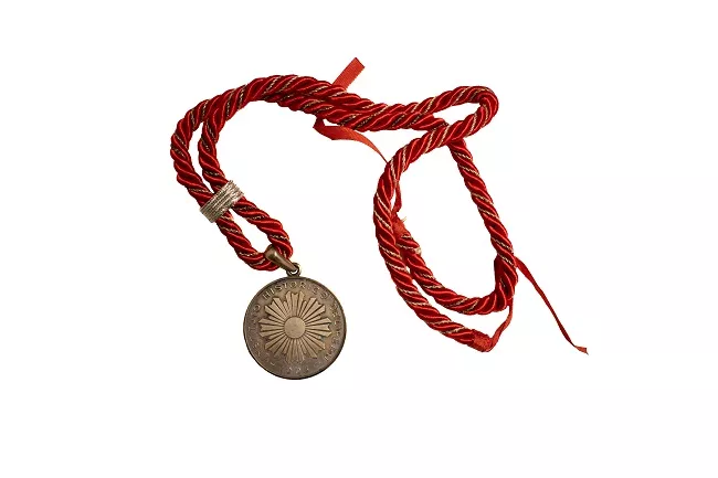 Pieza de metal blanco, de forma circular. El anverso presenta una figu...