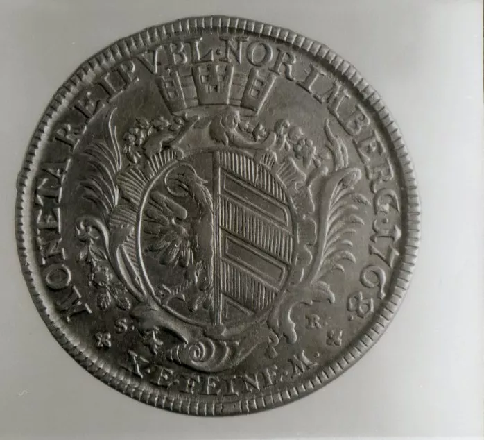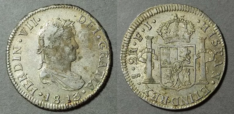 Moneda circular en cuya cara aparece el busto de perfil de Fernando VI...