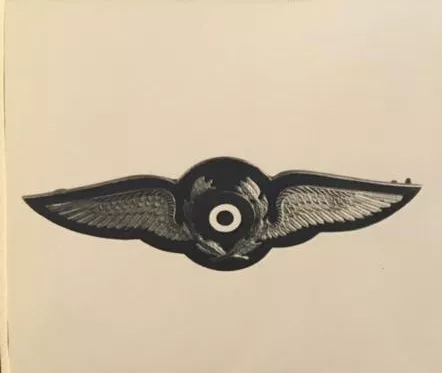 Objeto metálico con forma irregular. Representa dos alas doradas sobre...