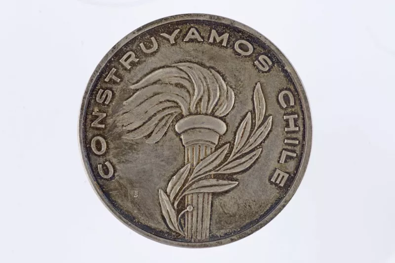 Medalla circular de metal. El anverso presenta una antorcha y una rama...