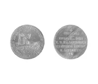 Objeto metálico de formato circula. En el anverso aparece un águila explayada bajo una corona imperial, con el escudo de Prusia en el pecho, rodeado por el collar del águila negra. Dentro del escudo, el escusón de los Hohenzollern.
