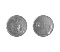 Objeto metálico de forma circular. Por el anverso representa dos busto...