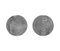 Objeto metálico de forma circular. Por el anverso el campo borroso representa un busto de perfil hacia la derecha, con leyenda alrededor. Por el reverso una imagen central borrosa con leyenda circundante.