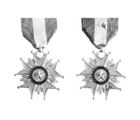 Medalla en forma de estrella, tiene cinco brazos ubicados en forma rad...