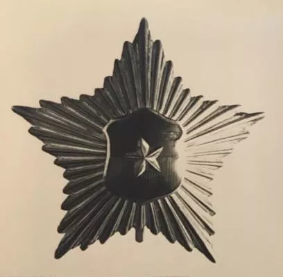 Objeto metálico con forma de estrella estriada, con un escudo de Chile...
