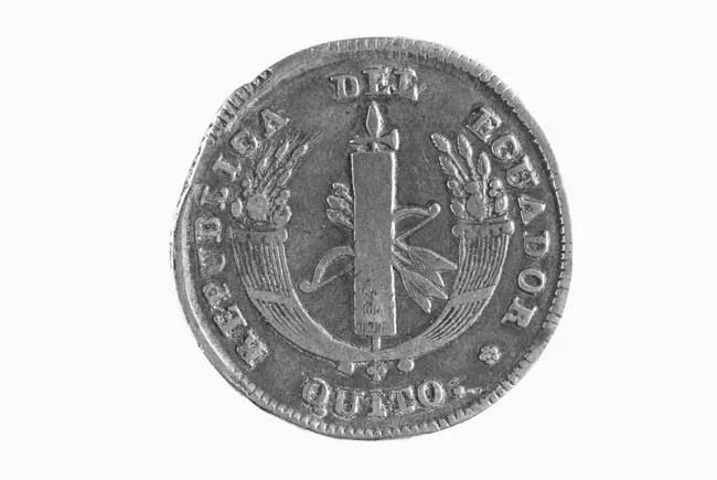 Moneda de 4 reales de la República de Ecuador, de forma circular.