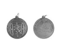Objeto metálico con forma circular y argolla en la parte superior. Por...