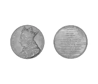 Objeto metálico de forma circular. Por una de las caras se distingue un busto masculino, con corona, de perfil hacia la derecha; por el otro lado representa una inscripción en el campo.