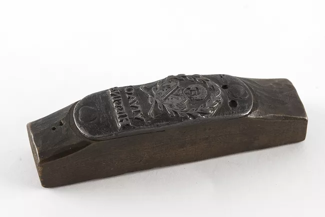 Pieza de madera en forma de prisma trapezoidal con placa ovalada de a...
