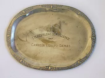 Objeto metálico de forma circular. Por una de las caras se distingue un busto masculino, con corona, de perfil hacia la derecha; por el otro lado representa una inscripción en el campo.