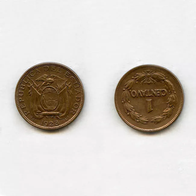 Objeto de forma circular de metal. Moneda de Ecuador en anverso escudo...