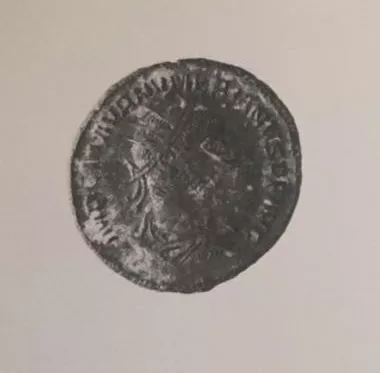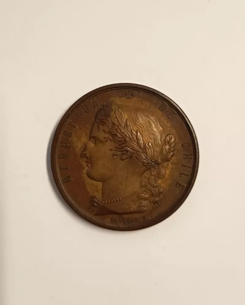 Objeto metálico de forma circular. Por el anverso representa un rostro...