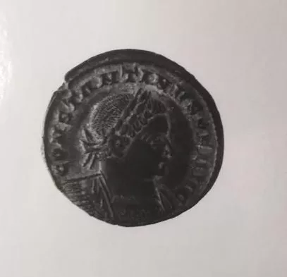 Objeto metálico de forma circular con dos caras borrosas. Una de las caras representa una inscripción central rodeada por corona vegetal. Por el reverso el campo se ve borroso.