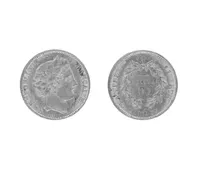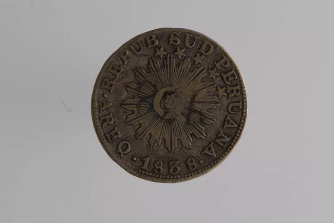 Objeto metálico de forma circular con dos lados. Por uno de los lados se distingue un busto masculino de perfil hacia la derecha, con leyenda circundante. Por el otro lado representa una figura en forma de paralelepípedo al centro, rodeado por leyenda.