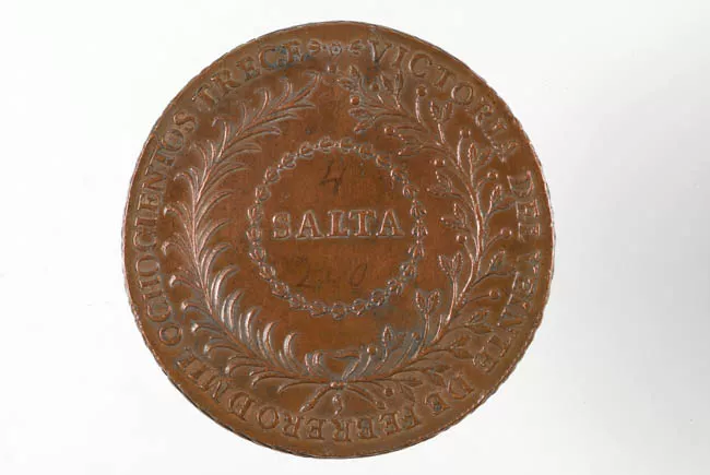 Moneda circular en cuya cara figura el escudo de Chile con un huemul y...