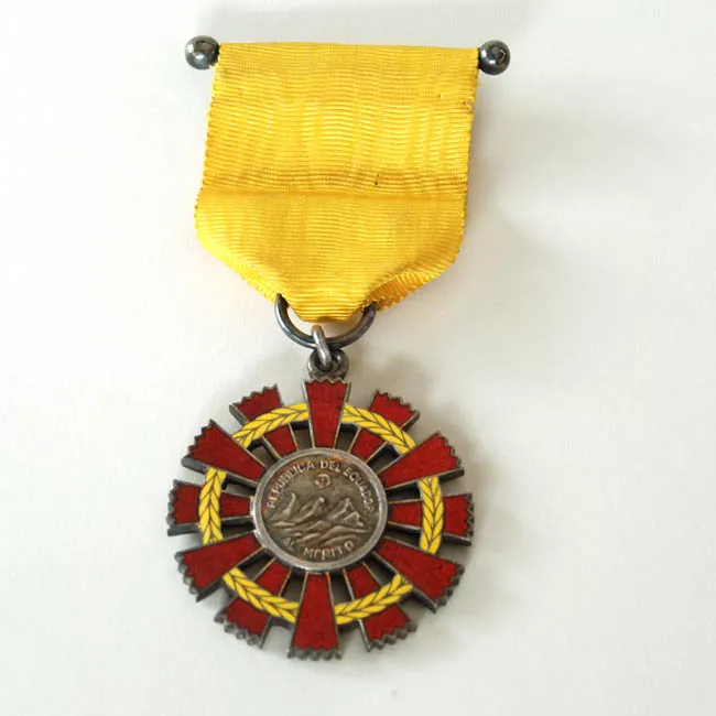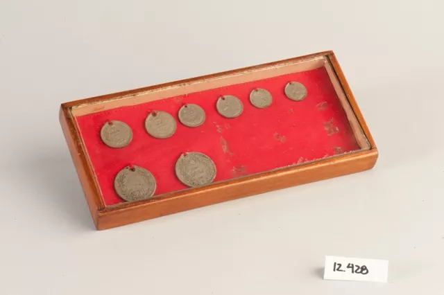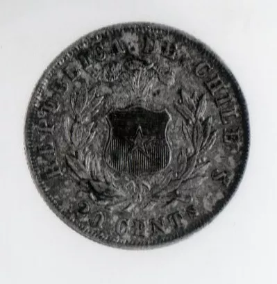 Forma ovalada. Fabricada en metal de color plateado oscuro. El anverso presenta, números y líneas poco definidas Al reverso, una cruz. .