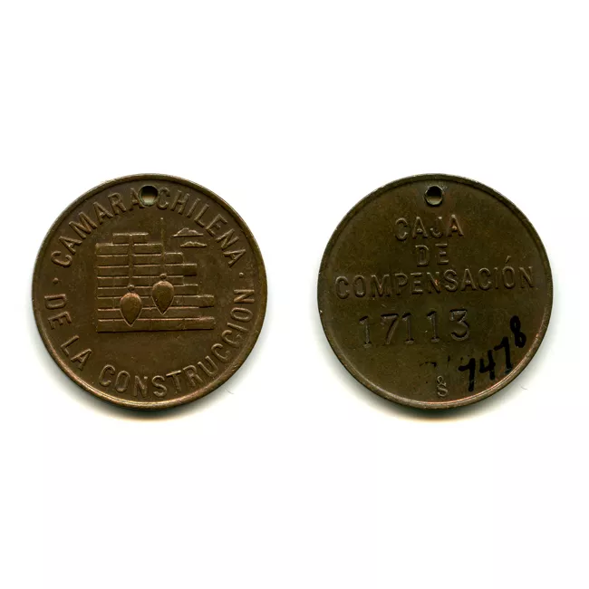 Forma circular. Fabricado en metal color marrón cobrizo. En la cara anversa presenta, cabeza masculina de perfil, circundada por letras en sobre relieve. Al reverso, figura femenina sedente con tridente y escudo circundado por letras en sobre relieve.