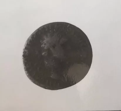 Objeto metálico de forma circular, bordes irregulares, con gráfila, ca...