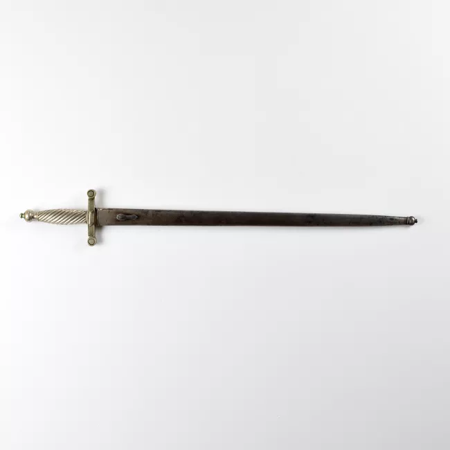 Munición de arma de fuego compuesta de punta y vainilla. Punta de fierro de forma cónica. Vainilla de bronce de forma cilíndrica y percutor anular, remata en una pestaña en su extremo.