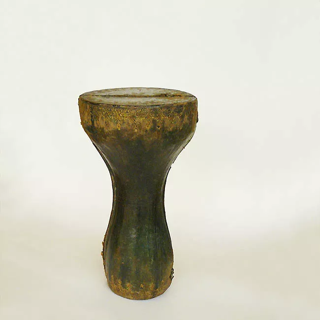 objeto para alumbrar. Simétrico, con dos cuerpos cilíndricos. Tiene un tubo delgado en el centro, también una perforación y una tapa atornillada. De metal color marrón oscuro, grisáceo y verde.