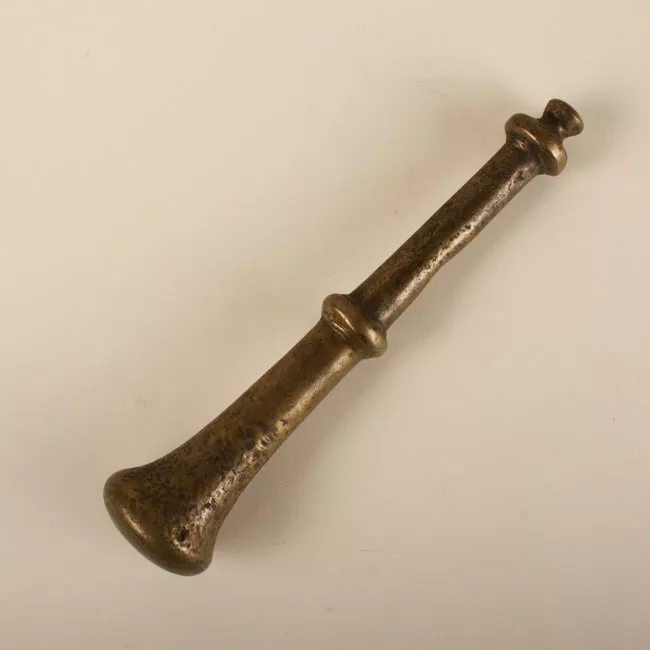 Objeto para alumbrar. Asimétrico de cuerpo ovoide, con un asa en cinta soldada al cuerpo. Tiene un mango ovalado en la parte superior que sale de la tapa. la parte frontal tiene forma de tubo donde se coloca la mecha. De metal color marrón rojizo y negro. Con inscripción.