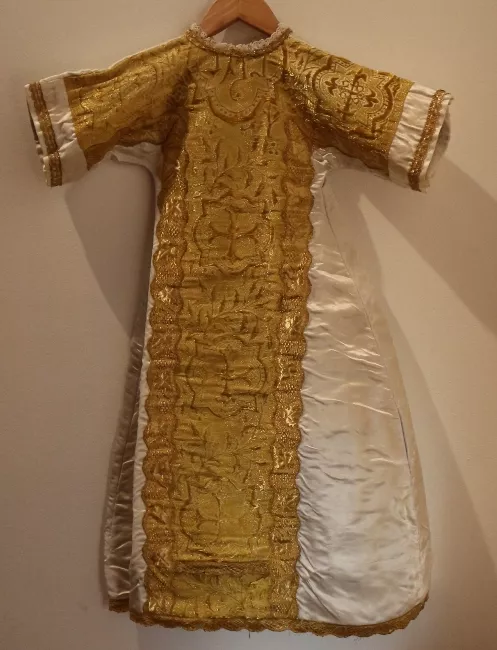 Vestido de esterilla recubierta con raso blanco y brocato dorado. Vest...