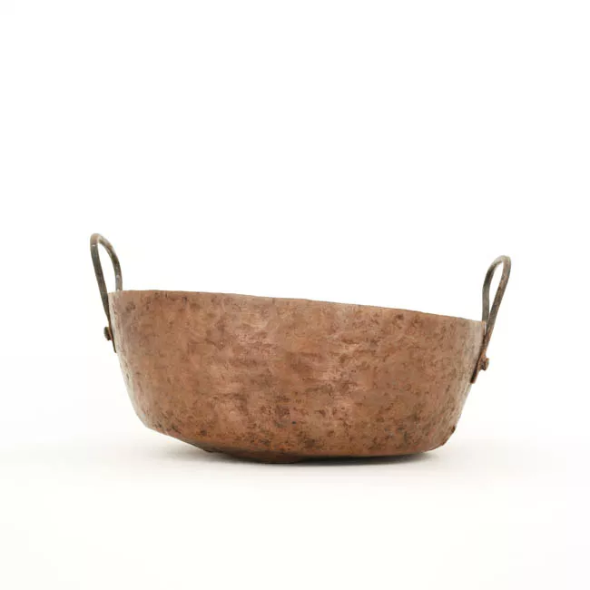 Objeto compuesto por un cuerpo simétrico, de forma ovoide, cuello cilíndrico, base convexa. Tiene una placa de refuerzo lateral remachada al cuello, de donde sale un asa en suspensión. Del borde se forma un vertedero. Fabricado en metal color marrón cobrizo y verde.