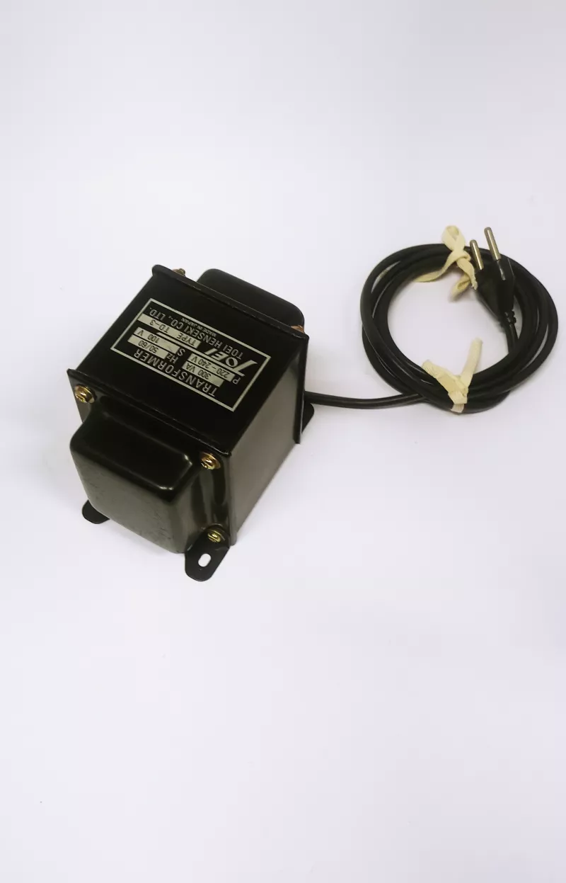 Objeto de use eléctrico. Pieza metálica rectangular negra con inscripc...