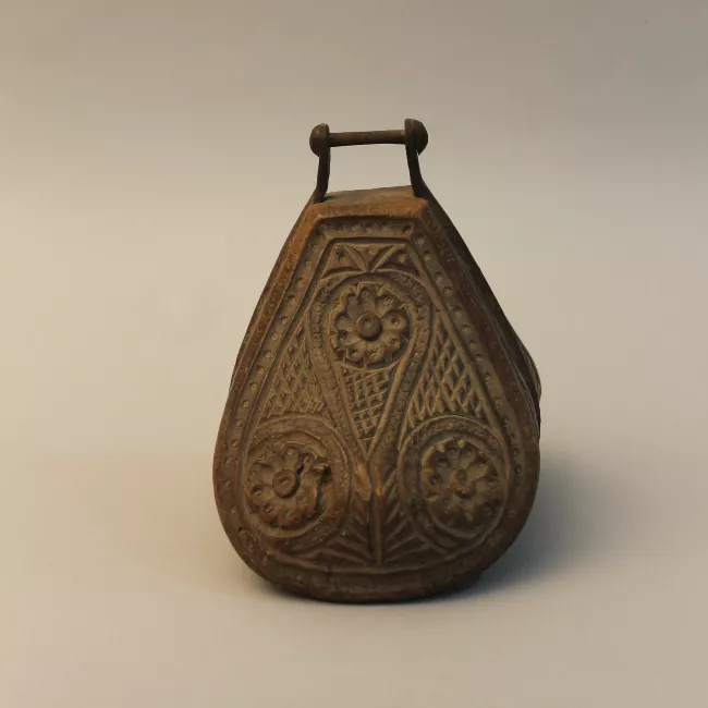 Objeto compuesto por un asta que remata en una especie de hebilla donde se ajusta las correas de la talonera. En el dentro de la curva del asta se encuentra el pihuelo, especie de horquilla donde se asegura la rodaja. La decoración del asta es casi imperceptible por el desgaste del material. Se utiliza en pares para picar al caballo durante la monta. Uno de los objetos perdió parte del pihuelo, y mantiene parte de la correa de la talonera.