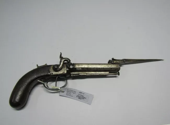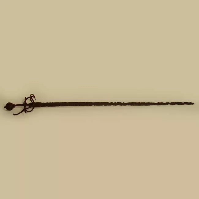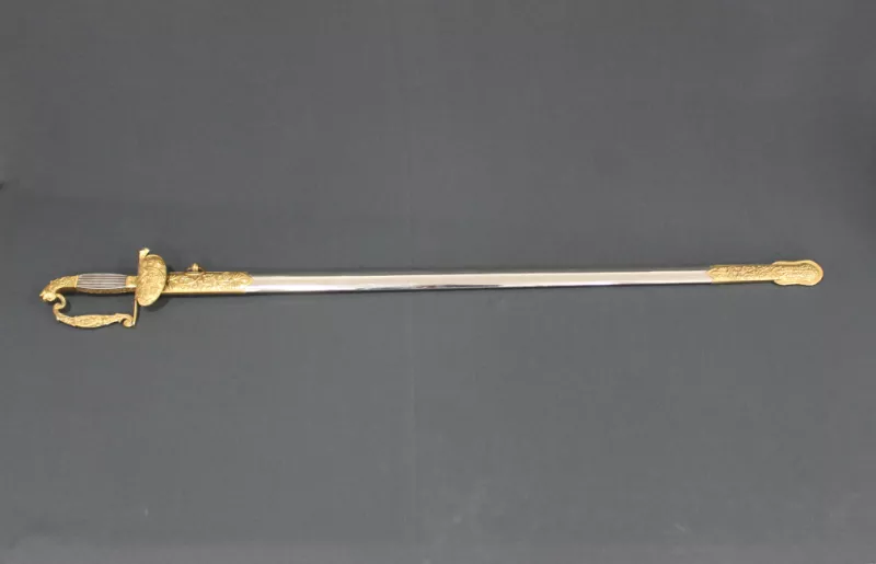 Arma blanco de mano corto-punzante. Compuesta de empuñadura, hoja y vaina. Empuñadura constituida por pomo de bronce, mango de madera recubierto en cuero con trenza de bronce, remata en cruz de bronce con un gavilán en dirección ala hoja y otro que se une con el pomo formando el guardamano. Hoja de acero ligeramente curvada, de un solo filo, con un vaceo central en ambas caras. Vaina de acero ligeramente curva con dos abrazaderas en su parte superior, rematadas en anillas.