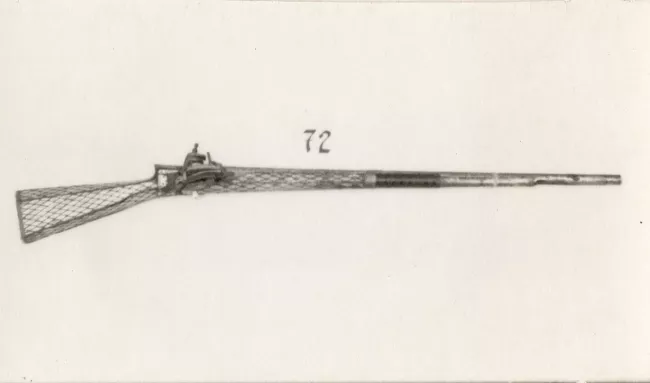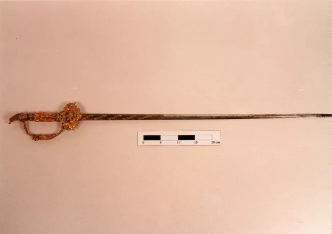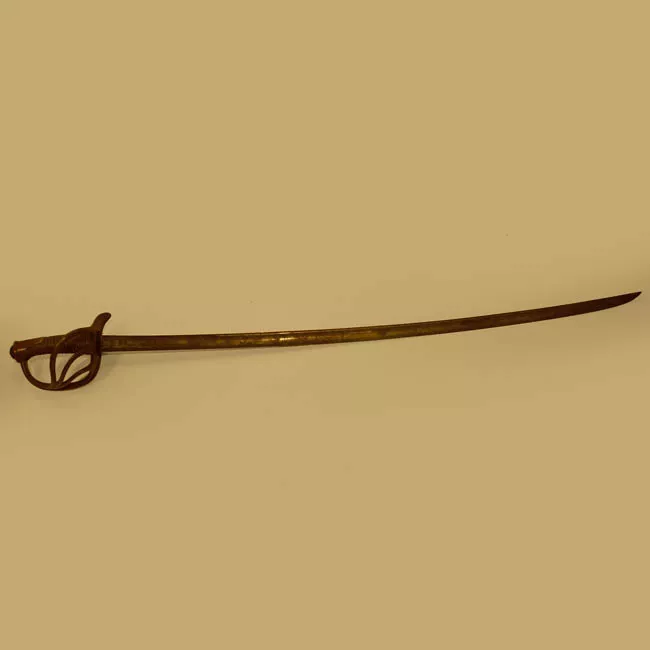 Arma blanco de mano corto-punzante. Compuesta de empuñadura, hoja y vaina. Empuñadura constituida por pomo de acero, mango de madera recubierto en cuero y fibra vegetal, remata en cruz de acero con un gavilán en dirección a la hoja y otro que se une con el pomo formando el guardamano. Hoja de acero, ligeramente curvada, de un solo filo con un vaceo central en ambas caras. Vaina de acero, ligeramente curva, con dos abrazaderas en su parte superior, rematadas en anillas.
