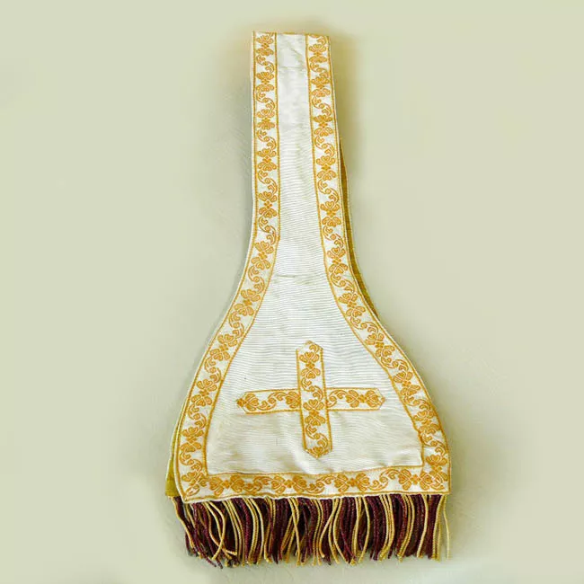 Objeto de madera tallada, de forma semioval, apuntado en la zona inferior. Al centro sobresale en relieve un escudo de color rojo, apuntado en la zona inferior. Sobre él hay una cruz dorada con una corona de nueve puntas. Sobre el madero vertical de la cruz se observa el crismón (letra "P" cruzada por la letra "X"). Sobre la zona superior del escudo se identifican de izquierda a derecha: un solideo de color blanco con bandas doradas e ínfulas de color blanco; una cruz; la zona superior de un báculo episcopal en forma pendum. Sobre la cruz hay un capelo de color verde, de cuyos extremos izquierdo y derecho se extiende un cordel tallado de color verde terminado en 6 borlas distribuidas piramidalmente. En la zona inferior se lee la frase “VENI DOMINE JESU”. Bordeando el lado izquierdo y derecho del escudo se inscribe “EMMANUEL LARRAIN E. EPISCOPUS TALCENSIS”.