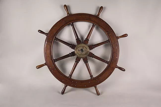 Objeto metálico compuesto de estructura en forma de C oblonga y vástago. La forma en C presenta bordes anchos y planos en el interior; el vástago tiene terminación en forma de moneda y mariposa en la parte inferior.