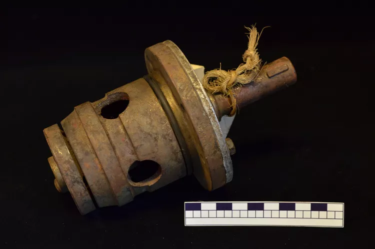 En el centro tiene una inscripción de letras ahuecadas rellenas con pintura roja. Tanto las asas como el interior están pintados de blanco,