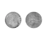 Objeto metálico de formato circular. En el anverso aparece el busto de...