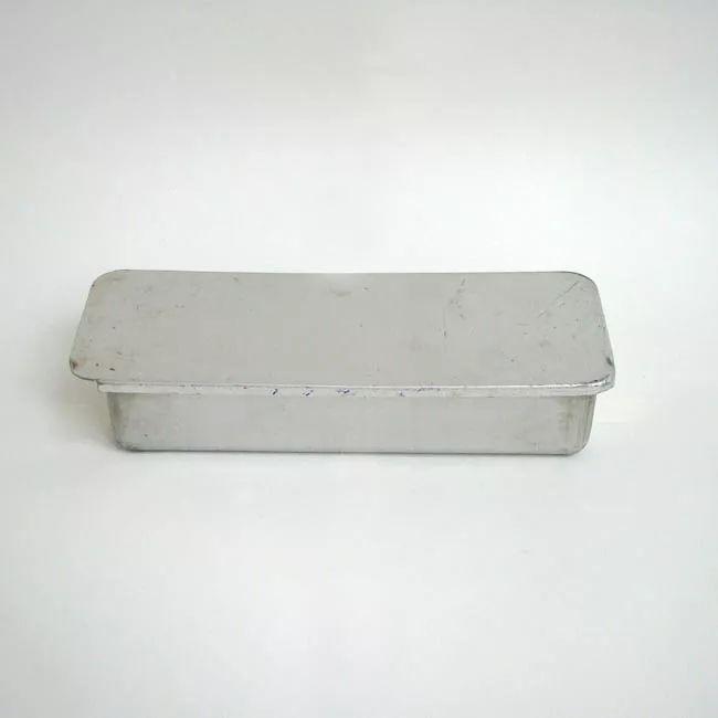 Objeto de metal, cóncavo con forma rectangular y paredes lisas. Los bo...