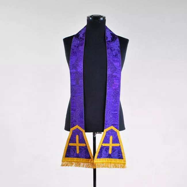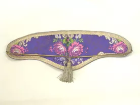Banda de tela morada, estrecha y más amplia en los extremos inferiores...